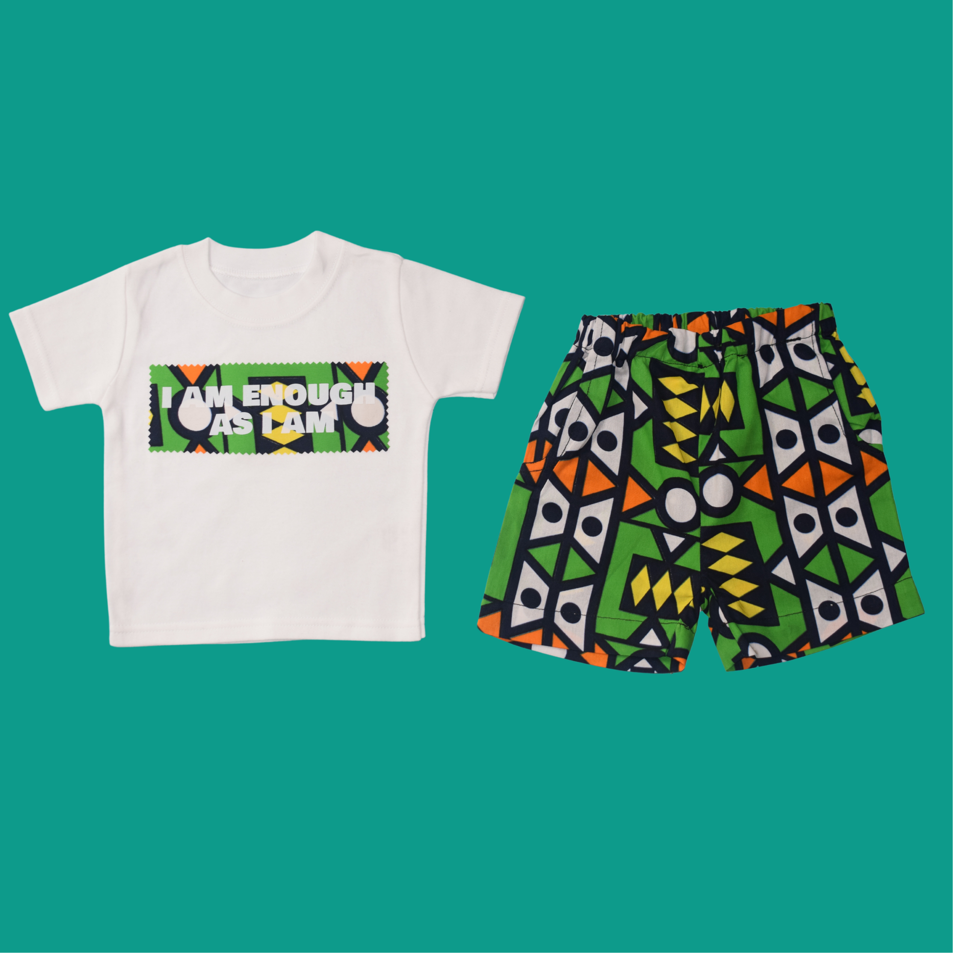 Dress your little one in confidence and vibrant style! This charming two-piece Ankara co‑ord set, featuring a playful "I AM ENOUGH AS I AM" slogan tee and bold, geometric-patterned Ankara shorts, is handmade with 100% breathable cotton. Tailored to order, it ensures a perfect fit and celebrates uniqueness, making it ideal for playdates, casual outings, or fun family photos.